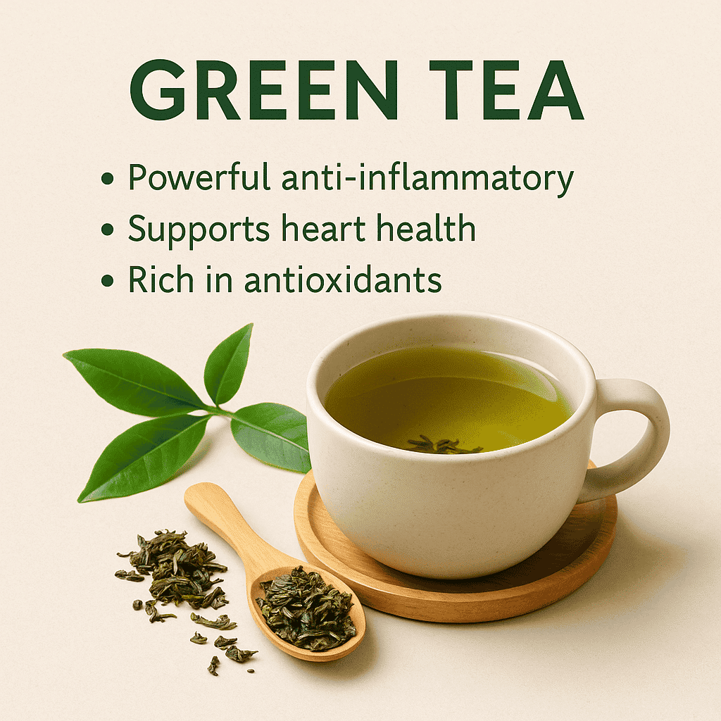 Why it helps: Green tea is loaded with catechins, gentle plant chemicals that lower common blood markers of inflammation. In dozens of human trials, people who drink green tea daily show smaller waistlines and less joint stiffness than non‑drinkers (study).