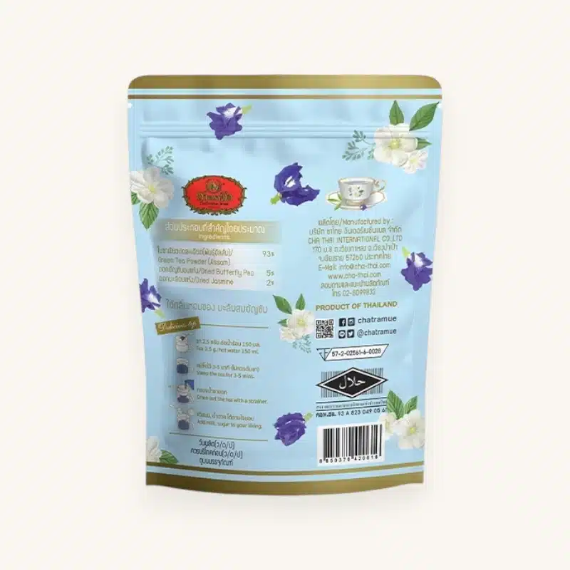 Cha Tra Mue Jasmine Butterfly Pea Tea is a naturally caffeine-free herbal infusion made from butterfly pea flowers (Clitoria ternatea) blended with fragrant jasmine. This stunning blue tea has been enjoyed in Thailand for generations and is now a global sensation thanks to its mesmerising colour-changing properties — add a squeeze of lemon and watch it transform from deep blue to vibrant purple!