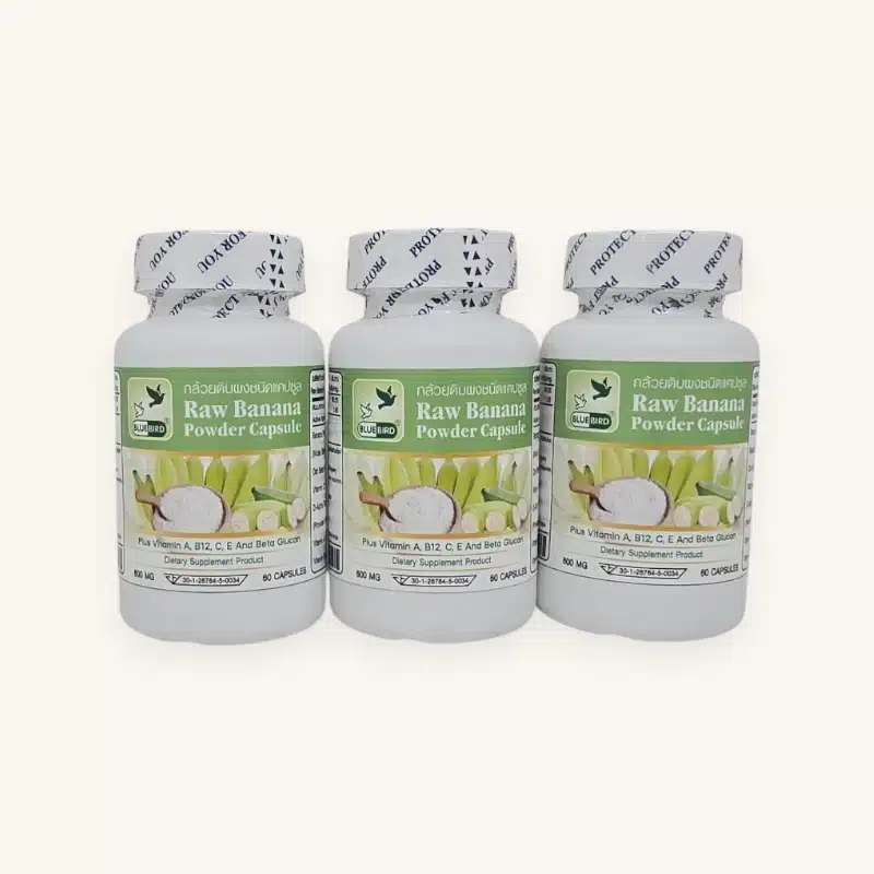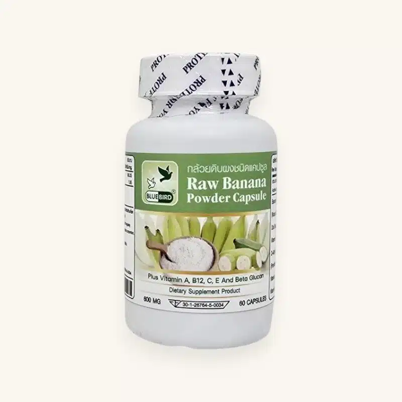 Raw Banana Powder Capsules by Blue Bird Thailand contain concentrated unripe Nam Wa banana (กล้วยน้ำว้า) — a traditional Thai remedy that has been used for generations to support digestive health and soothe stomach discomfort.