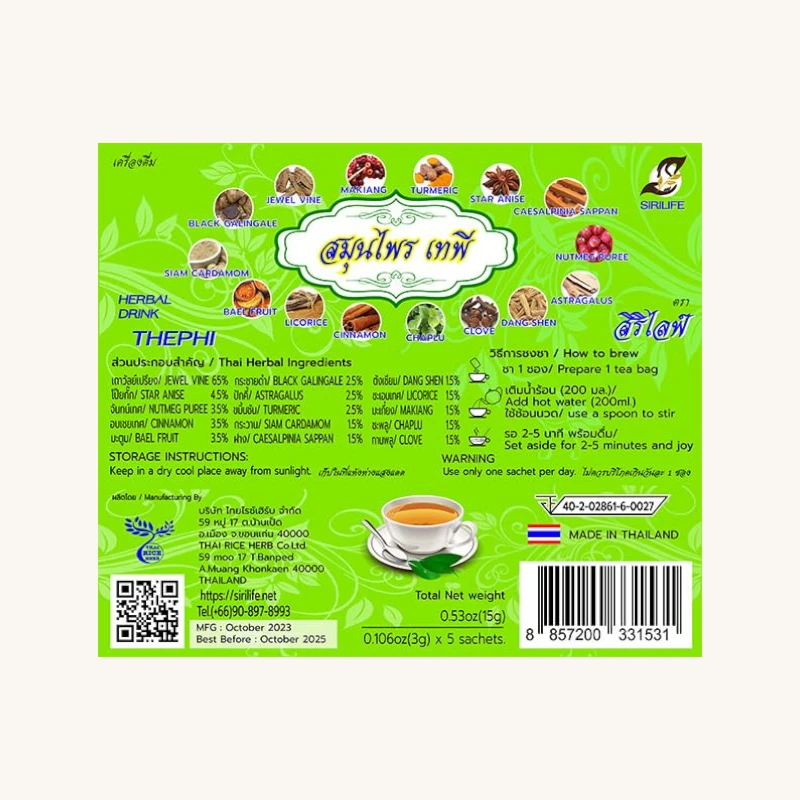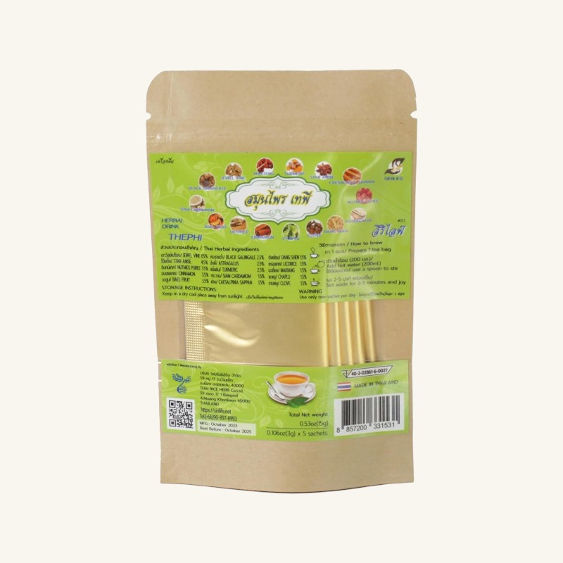 In English, the traditional Thai herbal tea blend is known by several transliterations—including Tapee, Tepee, and Thephi—all derived from the same original Thai name. The official English name recognized by the Thai FDA is “Thephi Herbal Drink,” but “Tapee Tea” remains the most commonly used and widely recognized name. Rest assured, all these terms describe the same beloved herbal tea.